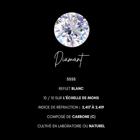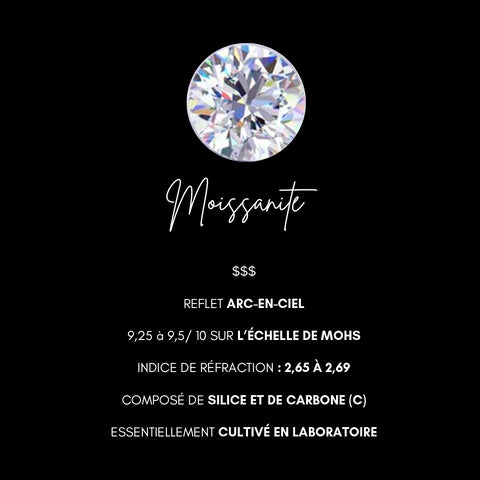 La Moissanite est une pierre précieuse synthétique qui offre une brillance similaire, voire supérieure à celle du diamant. C’est une alternative plus abordable tout en conservant une apparence luxueuse.